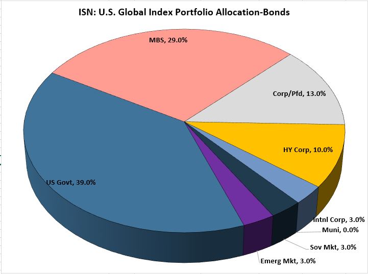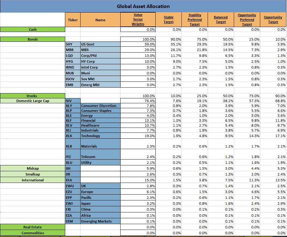 The table in Figure 1 is an asset allocation consideration that uses individual index securities for global coverage. The allocation amongst the index securities is determined by using the relative fair value for each domestic sector, domestic market capitalization, international market and bond classification. Overvalued areas have a lower allocation while undervalued areas receive a higher allocation. Bond allocations are determined on a market weight, relative yield and long-term average return basis.