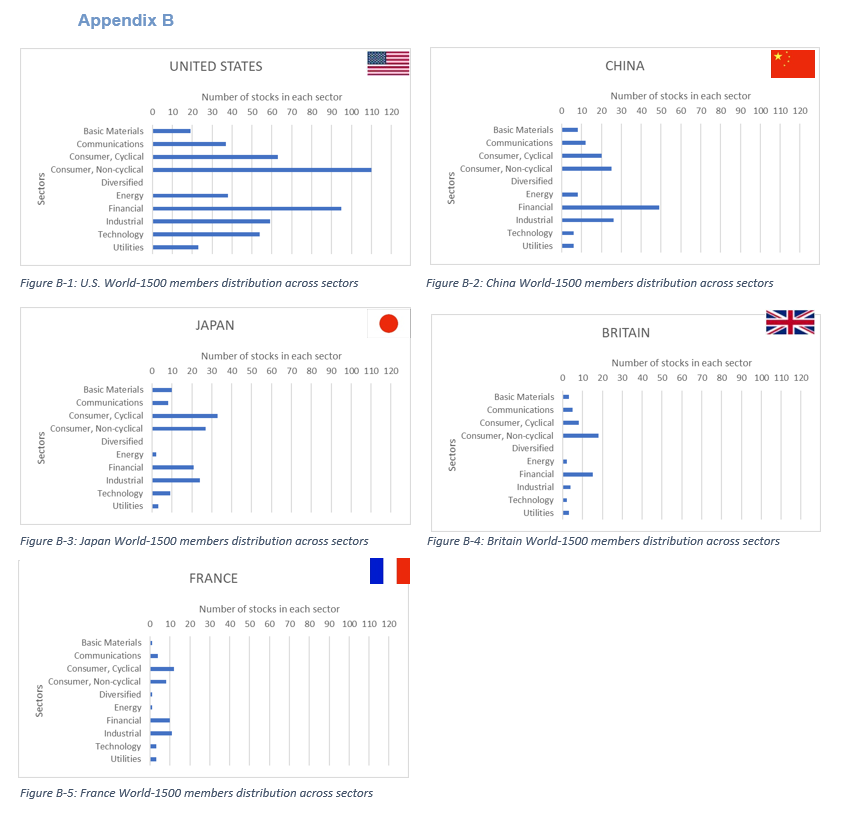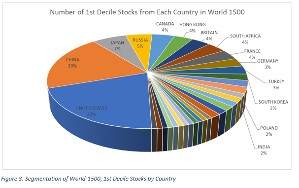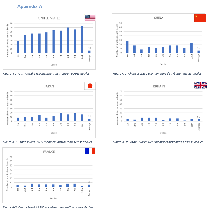 The Top 5 countries: U.S., China, Japan, Britain and France have very different distributions amongst the 10 deciles. Figures A-1 thru A-5 in Appendix A, show each of the individual countries and the respective distribution of stocks amongst the deciles.