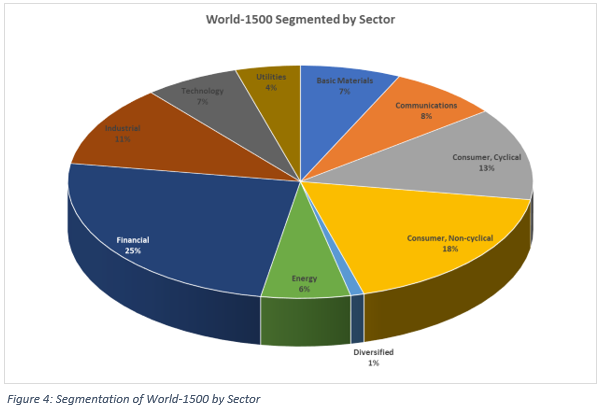 the entire World-1500 universe, Financial is the largest sector at 25%. The next two largest sectors are both consumer related, Non-cyclical at 18% and Cyclical at 13% representing a combined 30%.