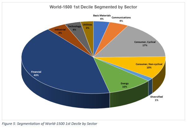 Many of the country rankings remained in the same order, but several new names entered the picture. India, Russia, South Africa and Turkey are present in the 1st Decile picture with greater than 1% of the total. Russia was the highest of the new arrivals at 5% with less than 1% of the total World-1500, and South Africa represents 4% of the 1st decile stocks.