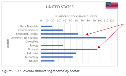 There are ten sectors that cover the global markets: Basic Materials, Communications, Consumer Cyclical, Consumer Non-cyclical, Diversified, Energy, Financial, Industrial, Technology and Utilities. Figure 4 is a pie chart showing the representation of each sector. Within