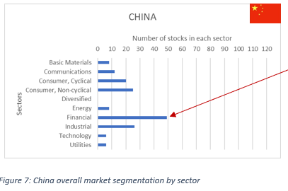 The number 2 market is China (Figure 7) and dominance is clearly in Financials followed by Industrials and Consumer related stocks. Energy, Technology and Utilities are less important in the overall picture in China when compared to the U.S., and it will be interesting to see how this changes over the next decade.