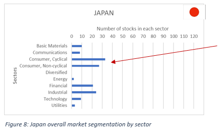 Japan is the third most important market and much different than either China or the U.S. in sector distribution. Japan is clearly dominated by consumer related sectors with Industrials and Financials following. Basic Materials, Communications and Technology are all on about equal footing in the overall distribution. (See Figure 8)