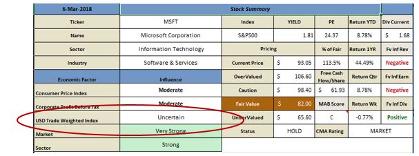 Today we are starting to show the influence of the US$ on U.S. stocks within the database. Each individual stock’s data sheet will now have a notation titled USD Trade Weighted Index. Figure 1 provides a cutout of the table that is available through the stock search menu option.