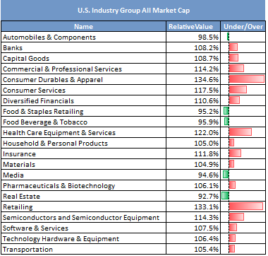 Industry groups also improved over the week with 2 groups overvalued and only 1 at Cautionary level. Consumer Durables & Apparel reached 135% Fv and Retailing 133% Fv. Food & Staples Retailing moved from slightly overvalued to slightly undervalued being one of the 5 undervalued industry groups.