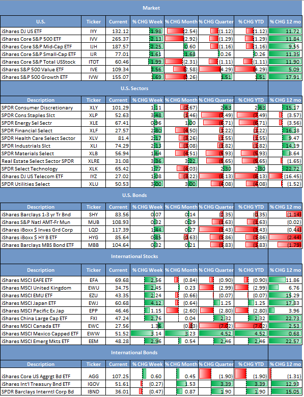 It feels like it has been a long time since we experienced a week where most of the changes in values were green, but it really hasn’t been that long. This week, everything was green for the week, and for the past 12 months we remain in the green and above long-term averages for all stock categories. Even SmallCap is in positive territory for the week, month, quarter and past 12 months. MidCap stocks took the lead posting a gain of 2.25%, followed closely by LargeCap stocks at 2.13%.