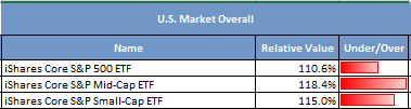 Valuations moved closer to 100% fair value (Fv). LargeCap is only 10 points away from this level. MidCap stands at 118.4% Fv with SmallCap at 115.0% Fv. There is a very good probability that the S&P Index (IVV) could reach $285/share over the next 12 months which places the DOW around 26,100. The easing of overvaluation pressure that has taken place in the first quarter of this year can support a return of higher stock market gains with support from favorable economic conditions. If these levels are reached it still places the market inside normal valuations and below the Cautionary valuation level. SmallCap index (IJR) has a strong likelihood of reaching $83/share and MidCap $201/share. They both may have a bumper ride than LargeCap because these values place them just inside the Cautionary level. However, if LargeCap supports the climb, it is highly likely the Mid and SmallCap segments will also reach these levels.