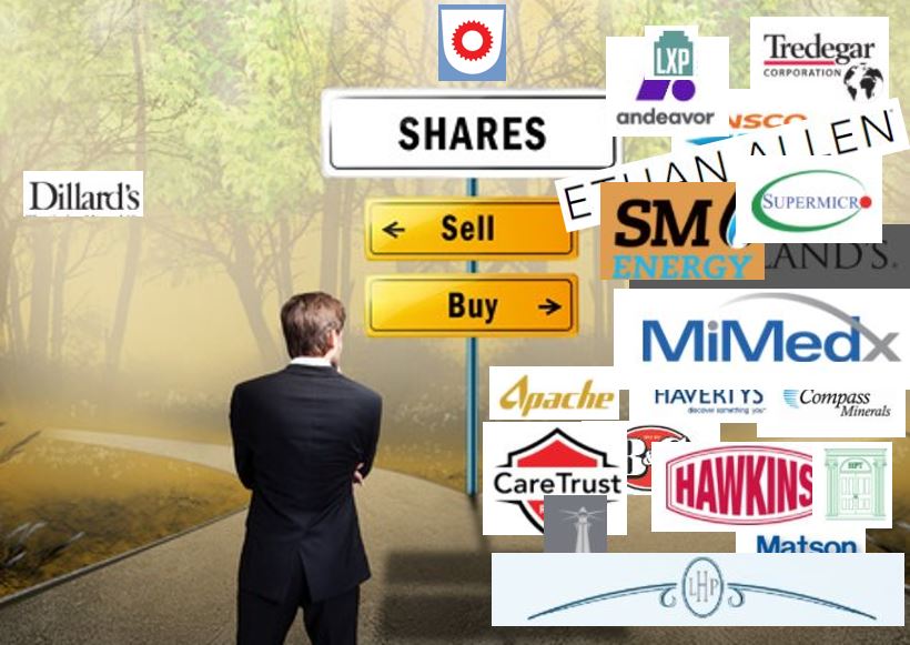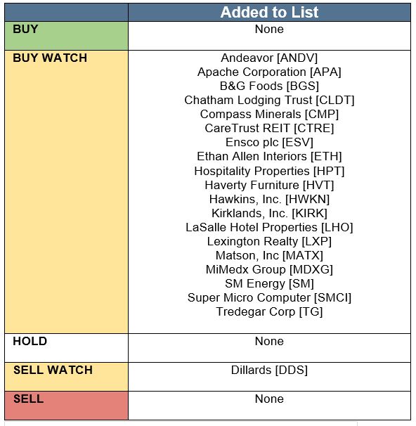 19 stocks move into Buy Watch consideration: Andeavor [ANDV], Apache Corporation [APA], B&G Foods [BGS], Chatham Lodging Trust [CLDT], Compass Minerals [CMP], CareTrust REIT [CTRE], Ensco plc [ESV], Ethan Allen Interiors [ETH], Hospitality Properties [HPT], Haverty Furniture [HVT], Hawkins, Inc. [HWKN], Kirklands, Inc. [KIRK], LaSalle Hotel Properties [LHO], Lexington Realty [LXP], Matson, Inc [MATX], MiMedx Group [MDXG], SM Energy [SM], Super Micro Computer [SMCI], Tredegar Corp [TG],
