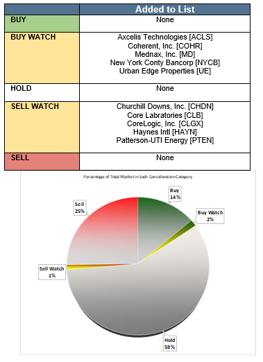 Stock Consideration Change Report: U.S. Hold consideration drops to 58% as Buy Watch and Sell Watch adds names. Steven Albrecht on April 27, 2018 Hold consideration drops to 58% as Buy Watch and Sell Watch adds names. Category: Consideration Changes Post navigation Previous: Previous post: Stock Fair Value Report: U.S.: UpdateNext: Next post: Stock Fair Value Report: U.S.: Update Posted by Steven Albrecht All Posts