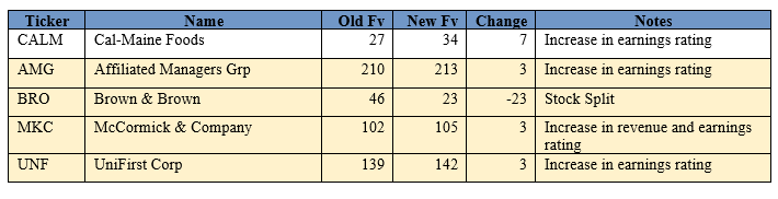 The following stocks have received a revised Fair Value (Fv) that represents 100% Fv for the company.