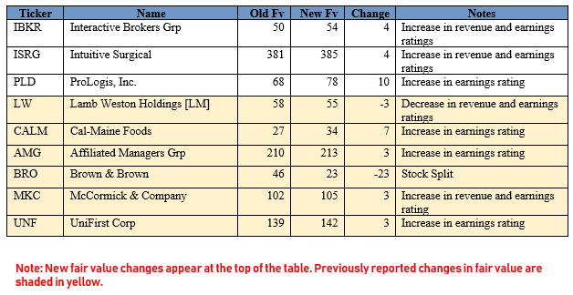 The following stocks have received a revised Fair Value (Fv) that represents 100% Fv for the company.