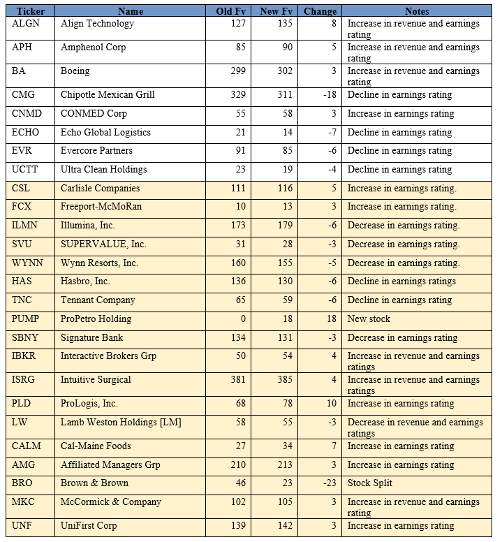 Align Tech, Amphenol, Boeing, CONMED all earn higher fair values. Chipotle Mexican Grill, Echo Global Logistics, Evercore, Ultra Clean move lower.
