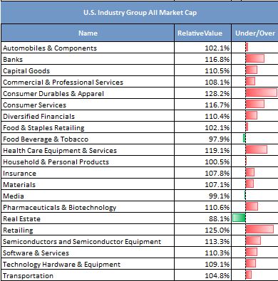 Over 90% of the industry groups are now within normal fair value range. This is an excellent improvement from the previous environment where nearly each sector was reaching new highs in terms of relative valuation. Higher