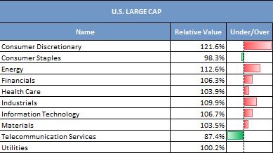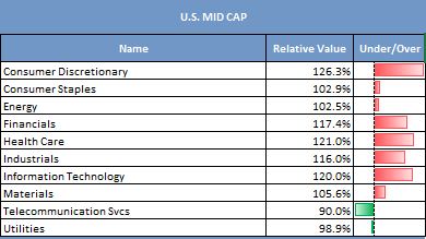 SmallCap sectors have also improved, but one, Health Care remains overvalued at 136.6% Fv. Even though                                                                                                                         high, it is much improved over the earlier level of 140.7% Fv. Health Care remains an area of high valuation across both MidCap andSmallCap market capitalization categories. Outside of Health Care the remaining SmallCap sectors are well positioned in valuation. Consumer Staples and Telecom both are under 100% Fv and only Tech is just on the edge of cautionary and fair at 120.6% Fv. Energy and Industrials are both very near 100% Fv.