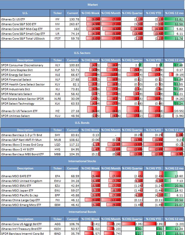 Bonds have not escaped the carnage with every major U.S. category at a loss year-to-date. The biggest hit was experienced in investment grade corporates with a loss of -3.57% followed closely by high yield corporates giving up -2.65%. Unfortunately, for the bond asset class, every category is also in a loss position for the past 12 months except for Municipals with a slight gain of 0.23%.