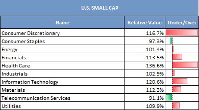 market capitalization categories. Outside of Health Care the remaining SmallCap sectors are well positioned in valuation. Consumer Staples and Telecom both are under 100% Fv and only Tech is just on the edge of cautionary and fair at 120.6% Fv. Energy and Industrials are both very near 100% Fv.